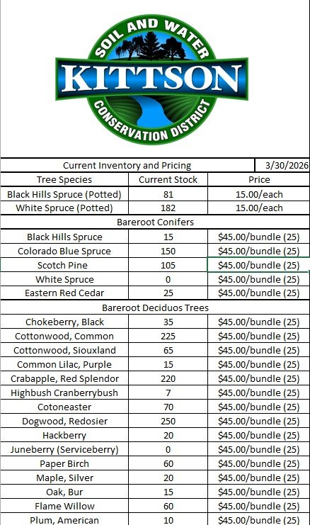 The Kittson SWCD annually sells thousands of trees to county landowners at a reduced cost for conservation. These trees are bare root stock conservation grade except for the 1 & 2 gallon potted Scotch Pine, Black Hills Spruce, and White Spruce.
